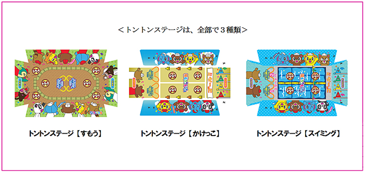 4)「トントンステージ」は、全3種類(「すもう」「かけっこ」「スイミング」)で、どれか1種類が入っています。