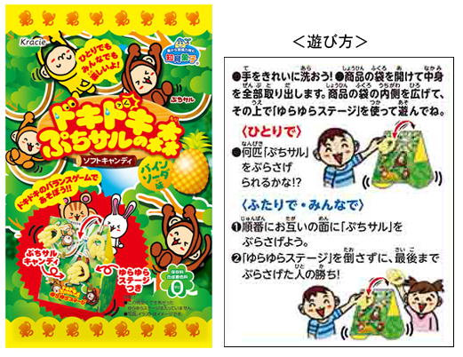 『ドキドキぷちサルの森』は、自分で組み立てた「ゆらゆらステージ」に、「ぷちっとくだもの」で人気のキャラクター「ぷちサル」のソフトキャンディを引っ掛けて遊んだり、お友達と「ぷちサル」を交互にぶら下げあって、バランスを取り合うゲームで遊んだりできる商品です。子どもから大人まで一緒に楽しめます。楽しく遊んだ後は、「ぷちサル」のソフトキャンディをおいしく食べることができます。