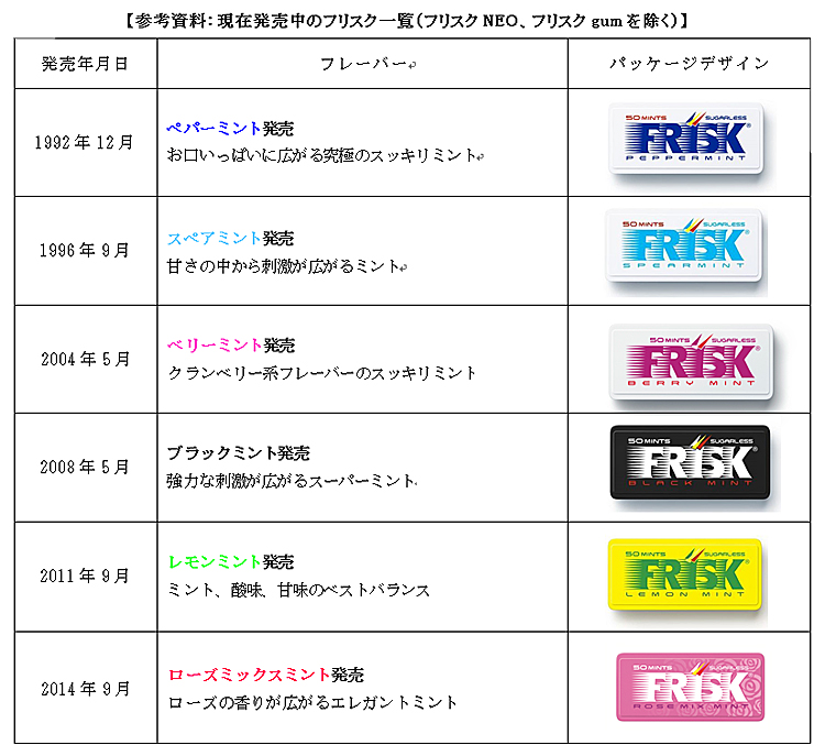 『フリスク チルドミント』は、冷感のある強力な刺激のミント味とソーダ風味のマッチした新しい味わいで、既存の「フリスク」の中では爽やかさが一番長続きするフレーバーです。