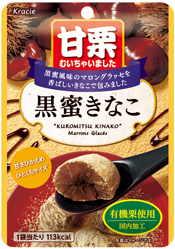 「甘栗むいちゃいました 黒蜜きなこ」は、「甘栗むいちゃいました」と同じ有機栗を長時間シロップに漬けて丁寧に仕上げたマロングラッセを、黒蜜でコーティングし、さらに香ばしいきなこで包みました。洋菓子のマロングラッセに和風の素材を加えた新しい味わいです。