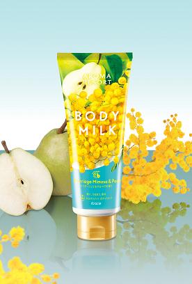 今回、大人の女性も楽しめる「マリアージュミモザ&ペアの香り」のボディミルクを、新たにラインに加えました。