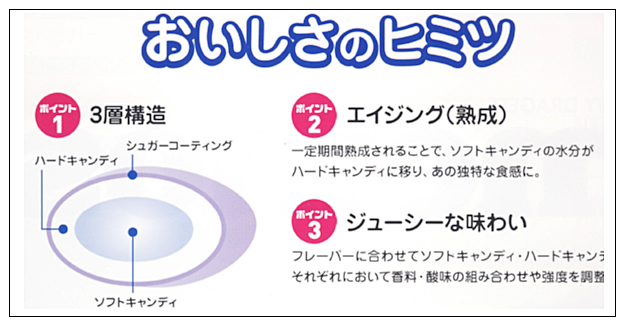 3)ソフトキャンディをハードキャンディで包み、更にシュガーコーティングした独自の3層構造から生まれる独特な食感が