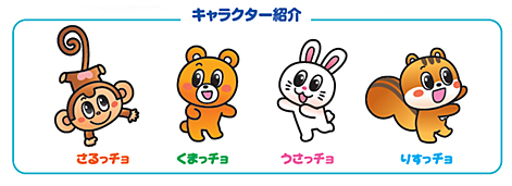 3)パッケージに登場するキャラクター(さるっチョ、くまっチョ、うさっチョ、りすっチョ)が「ひもで遊ぶ」楽しさを伝えます。