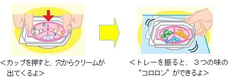 水で溶いてつくったクリームの上に穴の開いたカップをのせてギュっと押すと、穴からクリームが“にょきにょき”と出てきます。出てきたクリームに3つの味の粉をふりかけてトレーを振ると、外側はサクッと、中はふわっとしたふしぎな食感のお菓子“コロロン”ができあがります。詳細は下記の通りです。