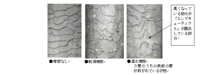 観察の結果、毛髪表面のキューティクル状態が異なっていることが確認できました。「乾燥した状態」で摩擦を与えた毛髪では、キューティクルの端の一部分だけが「欠けている」のに対し、「濡れた状態」で摩擦を与えた毛髪では、キューティクルの上の層が剥がれ、最下層の「エンドキューティクル」が「露出した状態」であることが判明しました。(図2)。