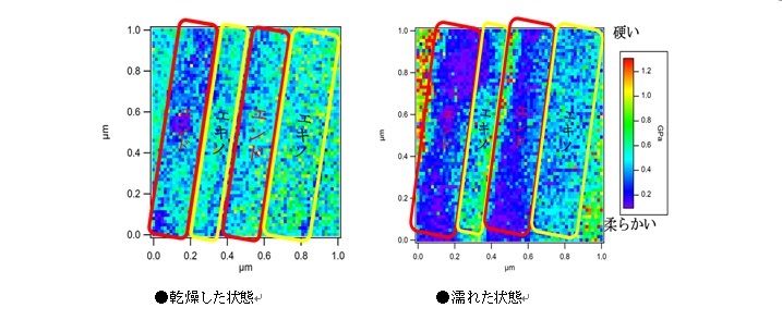 次に、原子間力顕微鏡を用いて「乾燥した状態」と「水に濡れた状態」で、キューティクルの層の硬さ(弾性率)を観察しました。すると「エンドキューティクル」は水に濡れると軟らかくなることが確認できました(図3)。つまり「エンドキューティクル」は濡れて、ふやけているのです。
