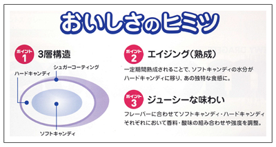 3)ソフトキャンディをハードキャンディで包み、更にシュガーコーティングした独自の3層構造から生まれる独特な食感が