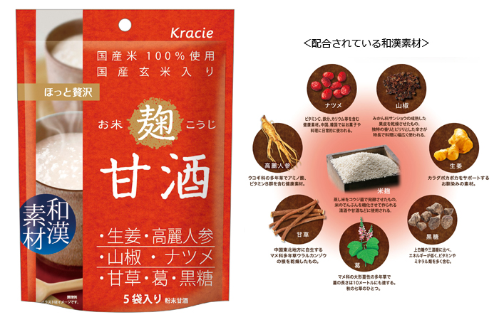 国産米と和漢素材の黒糖、生姜、高麗人参、山椒、甘草、葛、ナツメなどを贅沢に使用し、濃厚な風味とつぶつぶ食感が楽しめる商品に仕上げました。お湯を注ぐだけで、手軽に濃厚な甘酒が楽しめます。