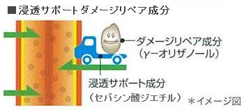 「浸透サポート成分」を組み合わせることで、米由来の「ダメージリペア成分」が素早く髪内部の傷んだ箇所へ浸透し、集中的に補修します。 |