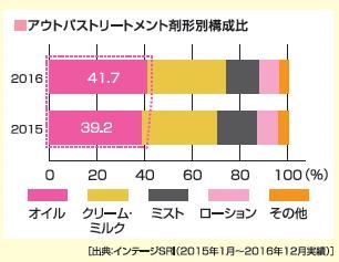 アウトバストリートメント市場は伸長傾向にあり、また、剤形別構成比は「オイル」が最も多く、約4割を占めています。また、ユーザーのヘアダメージ実感も年々高まり、より深刻化したヘアダメージに対応したアイテムの需要が高まっています。(2017年当社調べ)