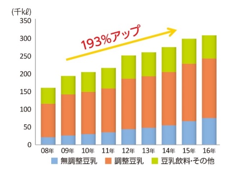 飲料やデザート等の豆乳関連商品も拡大しています。