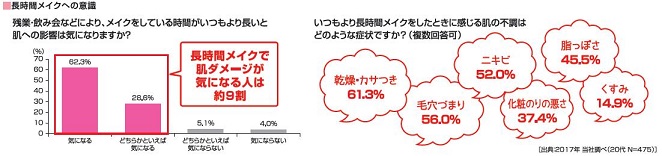 当社調査(2017年)では、毎日メイクをする20代女性の約7割が「メイクを落とさず寝てしまった経験がある」と回答しています。また、残業や飲み会などでメイクをしている時間が通常より長い場合、肌への影響が気になる人が約9割にも上り、実際、肌にダメージを感じる人も多いという結果です。 メイクを長時間した肌では、ファンデーションに配合されている顔料等が皮脂や水分を吸着して乾燥状態になったり、アクネ菌が活性化してニキビができやすくなるなど、ダメージが進みやすい状態となっています。 |