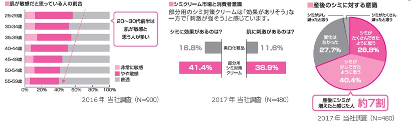 当社調査によると、20代~30代では「肌が敏感だと思う」人の割合が高い傾向にある中、部分用シミ対策クリームに効果を期待する一方で、「肌への刺激が強そう」と感じている方がいることも分かりました。また、20代後半以降の女性は、結婚や出産などライフスタイルに変化が起きやすい年代ですが、特に「出産後にシミが増えたと感じた」方が約70%にも上ります。