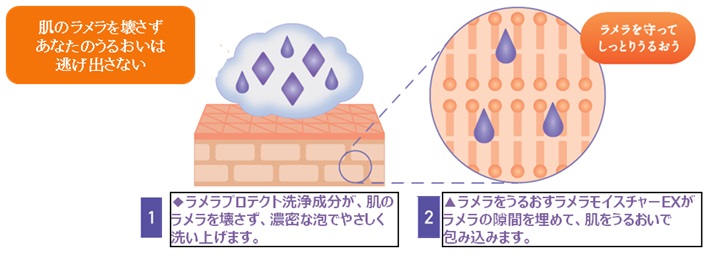 肌のうるおいに大切な「ラメラ」を壊さずに洗えるテクノロジー。お風呂上がりの保湿ケアがいらない、しっとりとした、うるおいのある肌へ導きます。