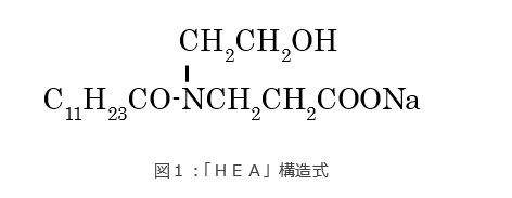 「HEA」は、N-アシル-N-メチル-β-アラニン塩のN-メチル基をN-ヒドロキシエチル基に置換して合成したアミノ酸系の界面活性剤です。