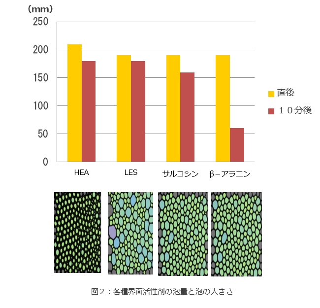 (2)新規界面活性剤「HEA」は、汎用界面活性剤と比べ、約2倍の泡量を実現。きめ細やかな均一な大きさの泡が特長。また、時間が経過しても、泡量を維持。