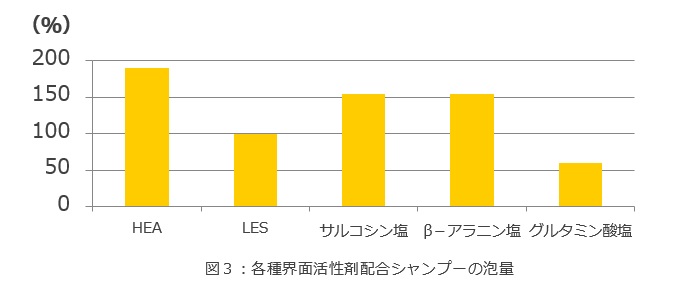 各種界面活性剤を配合したシャンプーを作成して、その性能を評価したところ、「HEA」では「LES」の約2倍の泡量を示しました。また「サルコシン塩」、「β-アラニン塩」と比べても、20%泡量が増加しており、汎用的にシャンプーに使用されている界面活性剤の中で、最も泡量が多い結果になりました。泡量が多いことによって、クッション剤ともなり、髪同士が擦れないことから、すすぎの際の指通りも良くなります。
