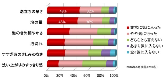 この「HEA」配合シャンプーを実用試験したところ、「泡立ちの早さ」、「泡の量」について、80%の方が「気に入った」という、今までにない高評価が得られました。また、「泡のきめ細やかさ」、「すすぎ時のきしみのなさ」も良好な結果が得られています。