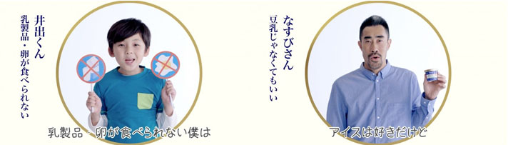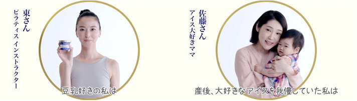 2.ストーリー:豆乳を使ったおいしいアイス「Soy」の魅力を、豆乳好きヘルシー志向な人、アイス好きの産後ママ、乳・卵アレルギーの人、豆乳じゃなくても良い人が伝える4篇の動画です。