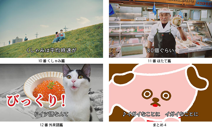 今回、新たに公開される動画は第4弾4編(「10番 くしゃみ篇」「11番 ほたて篇」「12番 外来語篇」「まとめ4」)です。「10番 くしゃみ篇」では「くしゃみの秒速は?」、「11番 ほたて篇」では「ほたての目の数は?」「12番 外来語篇」では、「かるた、ばってら、天ぷらの由来」など、ご好評いただいている「イガイガイ~♪」のメロディにのせて、新しい「イガイ」な事実をご紹介します。