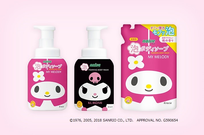「マイメロディ」は、サンリオキャラクター大賞で過去3回、第1位に輝いた大人気キャラクターです。そして、その「マイメロディ」の自称ライバルが「クロミ」です。今回のコラボレーションでは、ボトルにリバーシブルデザインを採用。表はピンクのずきんが可愛らしい「マイメロディ」、裏は黒いずきんとピンクのどくろがチャームポイントの「クロミ」の顔がデザインされ、1本で2つの異なるキャラクターを楽しめます。香りは自然でやさしい桃の香りで、ピンクがイメージカラーの「マイメロディ」にピッタリです。バスルームにも映えるポップなカラーと可愛らしい表情、そして「ナイーブ」ならではのさっぱり洗えるやさしい泡で、毎日のバスタイムを楽しくサポートします。