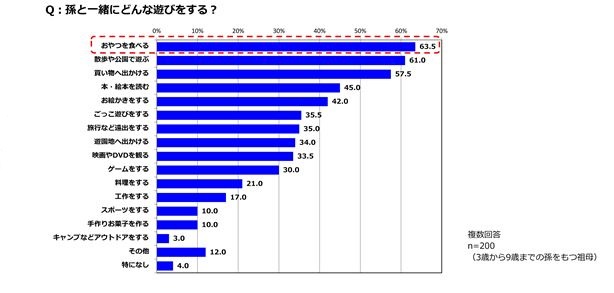祖母に対して、孫と一緒にどのようなことをして遊ぶかを尋ねたところ、第1位の回答は「一緒におやつを食べる」(63.5%)だった。以下、「一緒に散歩や公園で遊ぶ」(61.0%)、「一緒に買い物へ出かける」(57.5%)、「一緒に本・絵本を読む」(45.0%)、「一緒にお絵かきをする」(42.0%)が続いた。