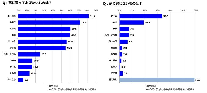 一方で、孫に買わないものについても尋ねたところ、全体の33.5%が「ゲーム」と回答し、以下、「DVD」(19.0%)、「衣服」(7.5%)、「スポーツ用品」(7.5%)、「ジュース」(6.5%)と続く結果が得られた。