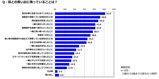 祖母を対象に、孫との経験で思い出に残っていることを尋ねたところ、「自分の家に泊まりにきてくれたこと」と回答した人が全体の51.0%で最も多く、孫と特別なことをしなくても、会うことが楽しいという祖母の思いがうかがえる結果となった。第2位以下は、「運動会で頑張っている姿をみたとき」(46.0%)、「孫の誕生日を祝ったこと」(44.0%)、「一緒に旅行へ行ったこと」(41.0%)、「動物園や水族館へ遊びにいったこと」(41.0%)と続いた。