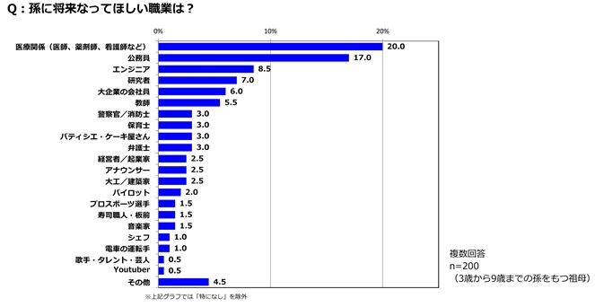 祖母を対象に、孫に将来何になってもらいたいかを尋ねたところ、全体の20.0%が「医療関係(医者、薬剤師、看護師など)」と回答した。以下、「公務員」(17.0%)、「エンジニア」(8.5%)、「研究者」(7.0%)など、堅実な職業が上位にランクインした。