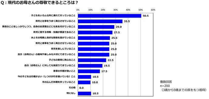 祖母を対象に、現代のお母さんに対して尊敬できるところを尋ねたところ、全体の約9割が「尊敬できるところがある」と回答した。「子どもをいろんな所に連れて行っていること」が50.5%で最も多い結果となった。以下、「育児と仕事をうまく両立させていること」(35.5%)、「家庭のことをしっかりしつつ、自身のおしゃれなどにも気を付けていること」(29.0%)、「育児に関する情報・知識が豊富であること」(27.5%)、「夫とその母親と良好な関係を築けていること」(25.5%)が続いた。