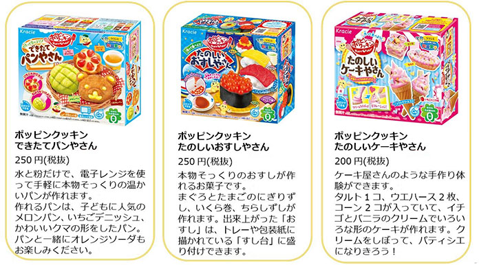 クラシエフーズは、子どもの豊かな創造力を育む商品として好評の知育菓子(R)シリーズより、水と粉だけで本物そっくりなお菓子作り体験ができる、「ポッピンクッキン・シリーズ」を発売しています。お店屋さんのような手作り体験ができるので、お孫さんと一緒に楽しみながら作っていただけます。