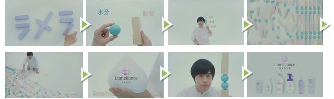 お肌の水分保持には、この「ラメラ」がきれいに整っていることが重要で、「ラメラ」が乱れてしまうと、たちまち水分が逃げて、乾燥しやすくなってしまいます。それを分かりやすく表現するため、大量に並べた積み木を少しずつずらして撮影することを何度も繰り返す「コマ撮り」の技法を採用しました。カクカクと動く積み木と、バカリズムさんの「うるおい!!」と言いながら慌てる様子から、「ラメラ」が乱れると水分が逃げてしまうことをイメージしていただきやすくしています。そして、「そんな『ラメラ』を壊さずに洗えるのが『ラメランス』」と商品を紹介します。