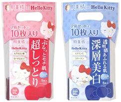 「肌美精 うるおい浸透マスク」は、たっぷりの美容液と心地よいシートが特長の、肌悩み別に手軽にスペシャルケアができるシートマスクシリーズです。今回、シリーズの中でも人気の高い「超しっとり」と「深層美白」の2種で、「ハローキティ」の限定デザインパッケージが実現しました。
