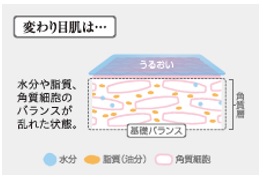 “変わり目肌”とは、皮脂量の減少や角質層が薄くなるなどの、肌の変化が起こっている状態のこと。水分や油分(脂質)の不足で角質層のバランス、つまり、「肌の基礎バランス」が乱れている状態です。