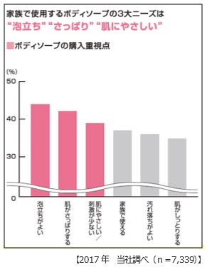 家族みんなで使えるボディソープ「ナイーブ」は、ユーザーから「サッパリ感」を評価いただいており、“ナイーブ=サッパリ”というイメージをお持ちの方が多くいらっしゃいます。「サッパリ感」は、「泡立ち」、「肌へのやさしさ」と並んで、家族で使用するボディソープの3大ニーズです(2017年 当社調査 n=7,339)。特に、すすぎ時の「サッパリ感」に対するニーズは高く、過半数(約66%)を占めています(2018年 当社調査 n=900)。
