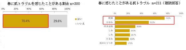 70%の女性が春に肌のトラブルを抱えたことがあると答え、さらに、春のトラブルとして女性を困らせているのは、「乾燥」と「かゆみ」の2大トラブルであることが判明しました。