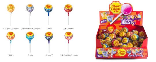 | 特徴 | ・発売以来、世界中で愛されるロリポップキャンディ「チュッパチャプス」 ・人気のフレーバー6種類(「コーラ」「ストロベリー」「プリン」「ラムネ」「グレープ」「ストロベリークリーム」)に、期間限定フレーバー2種類(濃厚な「マンゴースムージー」とほんのり甘酸っぱい「ブルーベリースムージー」)を追加 |