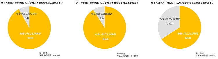 米国、中国、日本の母親に対して、母の日に子どもからプレゼントをもらったことがあるかを尋ねたところ、米国の母親の92.0%、中国の母親の91.0%、日本の母親の65.8%が「プレゼントをもらったことがある」と回答した。米国、中国の9割以上が「プレゼントをもらったことがある」と回答した一方で、日本は6.5割と3カ国中最も低い割合となった。