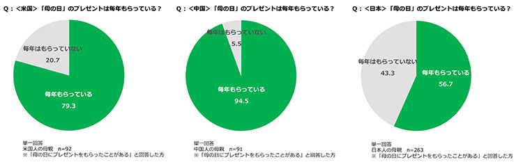 また、「母の日にプレゼントをもらったことがある」と回答した米国、中国、日本の母親に対して、プレゼントを毎年もらっているかを尋ねたところ、米国で「毎年もらっている」と回答した人の割合は79.3%、中国は94.5%、日本は56.7%で、中国においては毎年、母の日にプレゼントを贈ることが習慣となっていることがうかがえる結果となった。