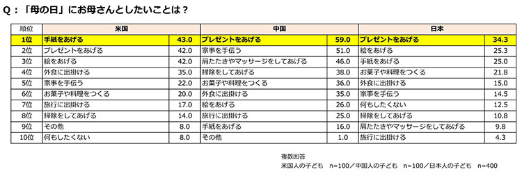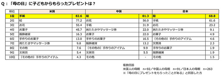 母の日のプレゼントにもらうもの第1位、米国は「手紙」、中国と日本は「絵」。米国では「お菓子」、中国では「肩たたき券やマッサージ券」という回答も目立つ。