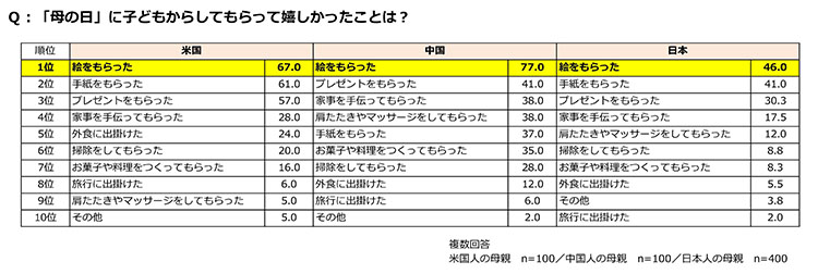 各国の母親を対象に、母の日に子どもからしてもらって嬉しかったことを尋ねたところ、第1位の回答は、米国、中国、日本いずれも「絵をもらったこと」だった。