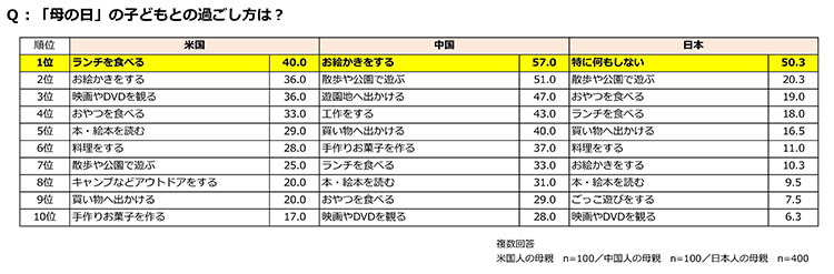 各国の母親を対象に母の日の子どもとの過ごし方を尋ねた。最も多かった回答は、米国が「ランチを食べる」(40.0%)、中国は「お絵かきをする」(57.0%)、日本では「特に何もしない」(50.3%)という結果が得られた。