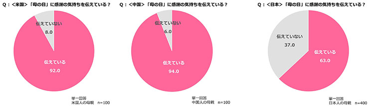 米国、中国の子どもの9割以上が「母の日に感謝の気持ちを伝えている」が、日本は6割にとどまる。