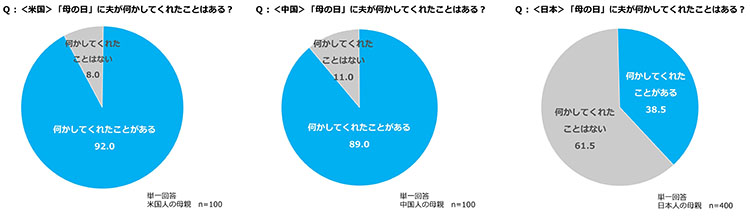 各国の母親を対象に、夫が母の日に何かしてくれたことがあるかを尋ねたところ、「母の日に夫が何かしてくれたことがある」と回答した人は、米国では92.0%、中国では89.0%と約9割が回答しているのに対し、日本ではわずか38.5%にとどまった。さらに、夫が何をしてくれたかについて尋ねたところ、第1位の回答は、米国と日本では「プレゼントをもらった」(米国:73.0%、日本:25.0%)、中国では「家事を手伝ってもらった」(52.0%)だった。