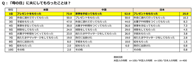 夫から母の日にしてもらったこと、第1位は米国と日本は「プレゼントをもらった」、中国は「家事を手伝ってもらった」