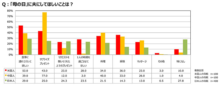 各国の母親を対象に母の日に夫にしてほしいことを尋ねたところ、最も多かった回答は、米国と日本は「食事に連れて行ってほしい」、中国は「サプライズプレゼント」だった。