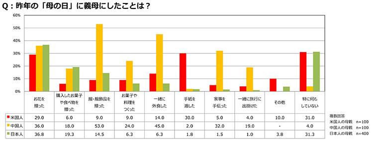 「母の日に夫が何かしてくれたことがある」と回答した人は、米国では92.0%、中国では89.0%と約9割が回答しているのに対し、日本ではわずか38.5%にとどまった。