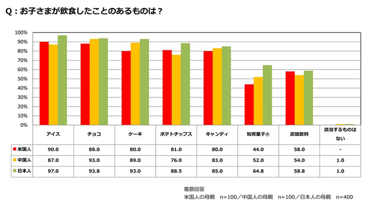 「アイス」「ケーキ」「ポテトチップス」など、子どもに人気のお菓子・飲料7種類すべてにおいて、米国、中国より日本のほうが飲食したことがある子どもの割合が多い。