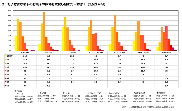米国、中国、日本の母親に対して、「アイス」「チョコ」「ケーキ」「ポテトチップス」「キャンディ」「知育菓子(R)」「炭酸飲料」の7種類のお菓子・飲料について、子どもが飲食したことがあるかを尋ねたところ、すべてにおいて日本の子どもが「飲食したことがある」と回答した割合が最も高かった。さらに、それぞれのお菓子を子どもが食べたことがあると回答した各国の母親に対して、何歳から食べ始めたのかを尋ねた。3カ国平均で、「アイス」「ケーキ」は2歳から、「チョコ」「ポテトチップス」「キャンディ」「知育菓子(R)」は3歳から、「炭酸飲料」は5歳から食べ始めた子どもの割合が最も多いという結果が得られた。