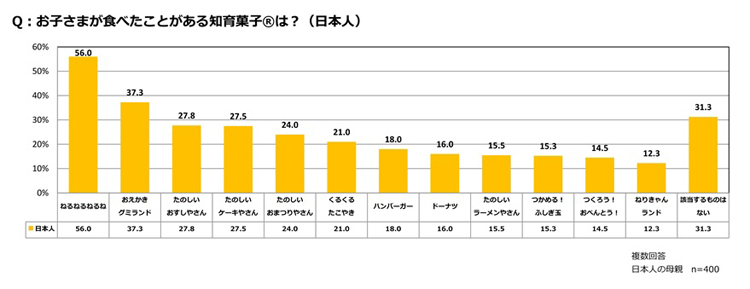 日本の母親を対象に、子どもが食べたことがある知育菓子(R)を尋ねた。最も食べたことのある子どもの割合が多かった知育菓子(R)は、「ねるねるねるね」(56.0%)だった。以下、「おえかきグミランド」(37.3%)、「たのしいおすしやさん」(27.8%)、「たのしいケーキやさん」(27.5%)、「たのしいおまつりやさん」(24.0%)と続いた。